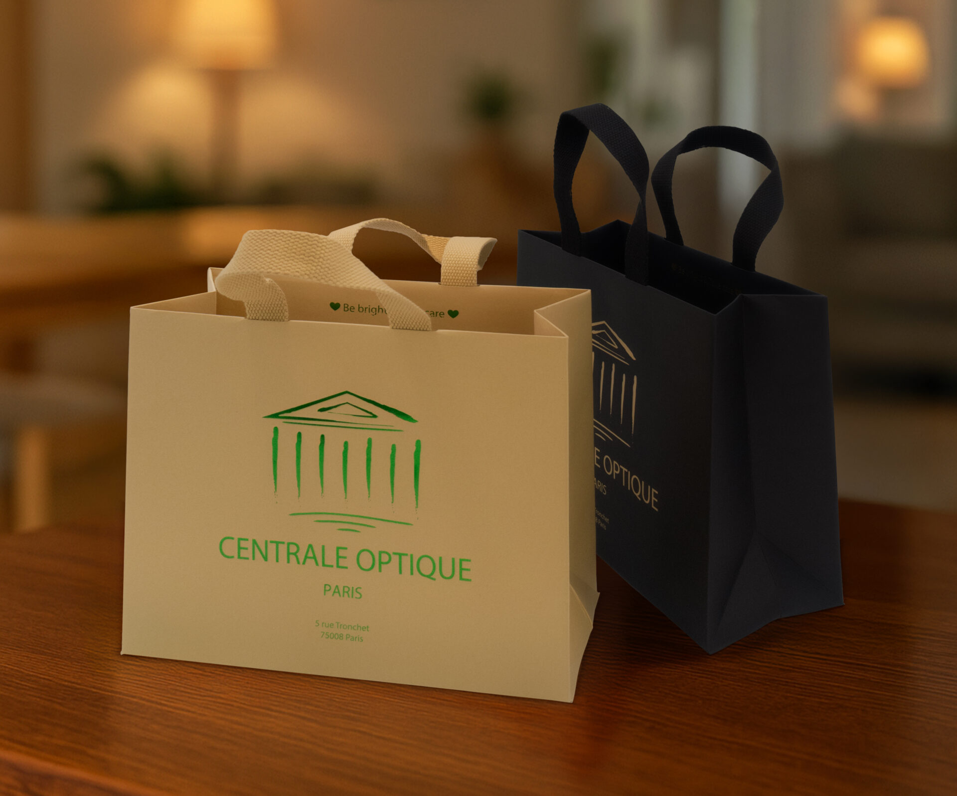 Un design original mettant en avant une monture de lunettes, accentuée par les anses qui prolongent le visuel. Minimaliste et moderne, parfait pour emballer des lunettes et accessoires tout en renforçant l’identité visuelle de l’enseigne.